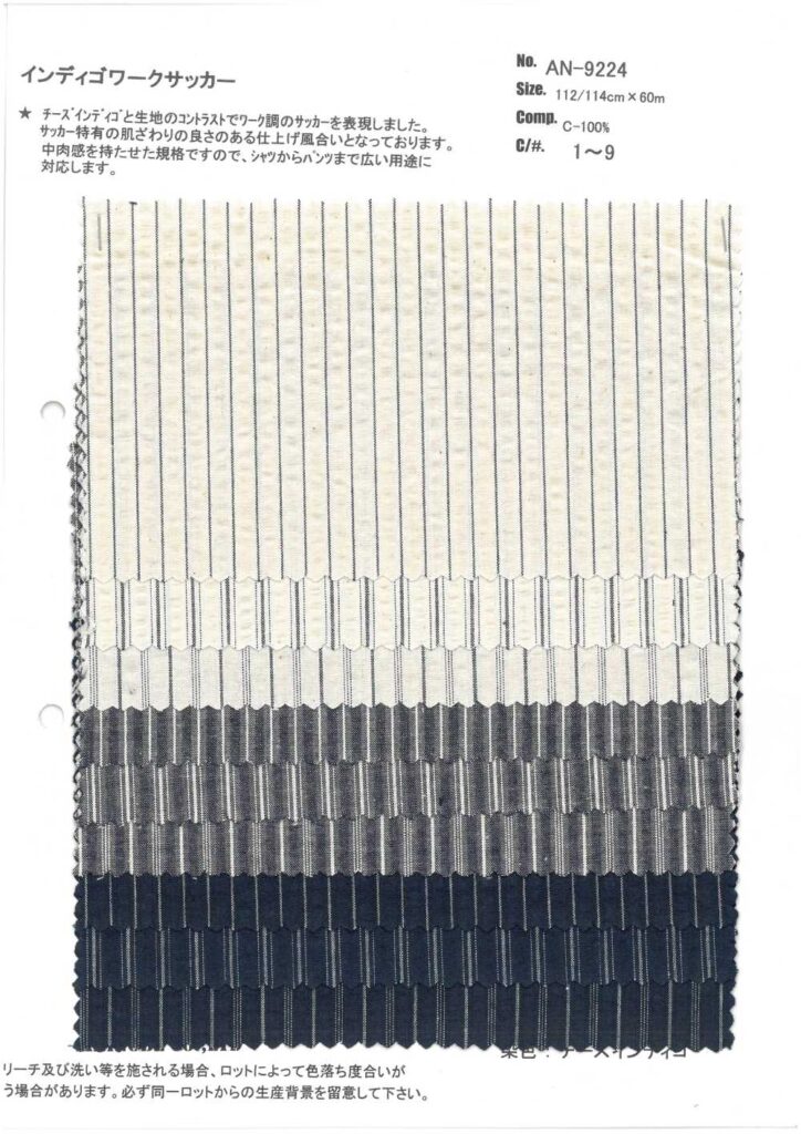 Vải tạo điểm nhấn với sự tương phản giữa màu chàm nhuộm theo phương pháp “cheese dye” và kết cấu seersucker, mang đến vẻ ngoài đậm chất vải đồ lao động.